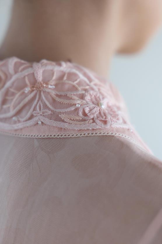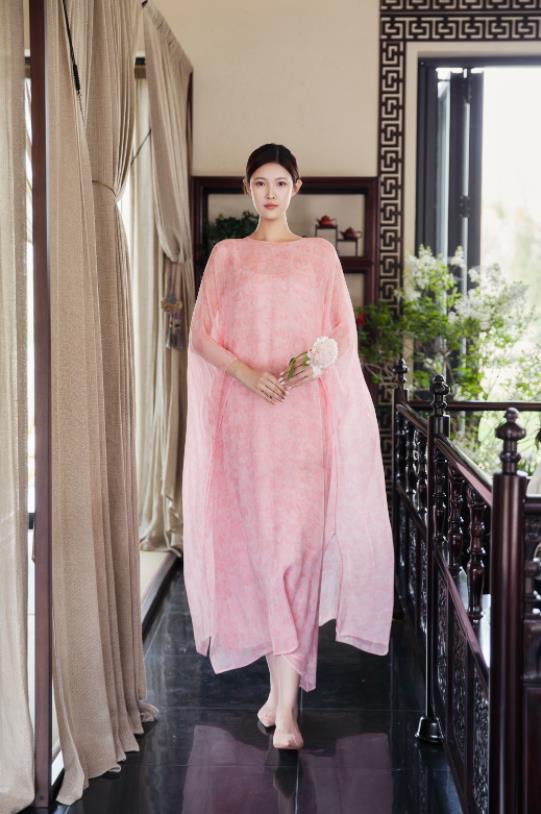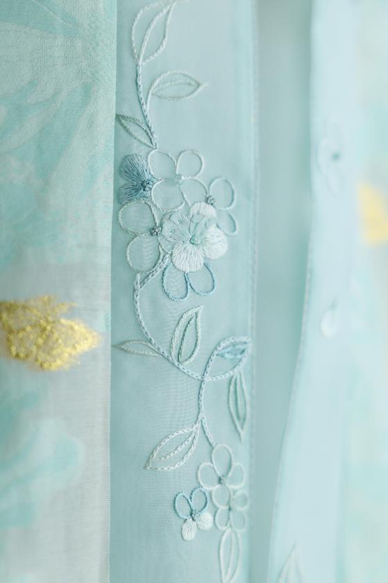 本系列以花罗为主打材质,辅以软烟罗、绡缎、双绉印花、正绢、缂丝等顶级天然面料, 光泽与垂感构成衣衫的温润底色。园中春意亦化为衣上纹样:缠枝纹象征生生不息,竹 叶纹隐喻君子品格,蝴蝶纹承载美好祝福。工艺则融汇非遗织造与精细手工,以刺绣、 缂丝、印染等技法,在衣帛上再现“春云浮空,流水行地”的意境,每一处针脚,都凝 结着手工的体温与时间的凝视。