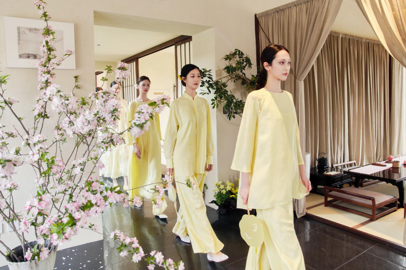 发布秀当日,蹊园本身即是最大的秀场。模特身着「游园」系列,穿行于园中。衣上花 蝶翩然起舞,虚实相生,情境交融。宾客不再是旁观者,而是跟随衣袂飘动的游伴,一 同走入画境。