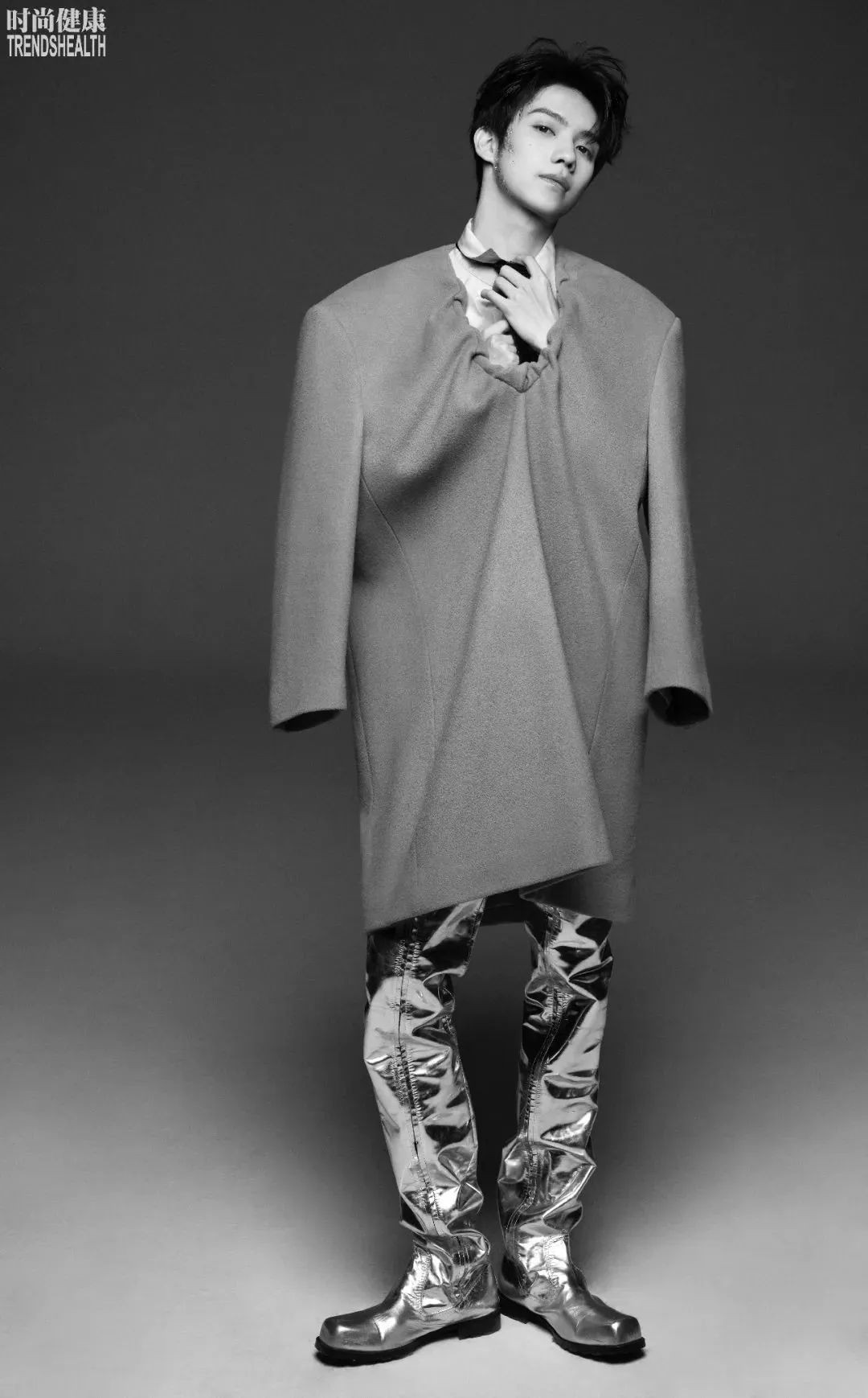 衬衫、领带、卡其色呢子外套、银色超长靴WE11DONE
