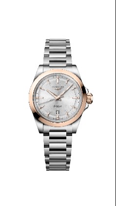 全新康卡斯悦动系列腕表,表盘直径30毫米,采用精钢与18K玫瑰金包金表圈及表冠组合材质,银色太阳纹表盘,搭配玫瑰金镀层指针。 3、6、9及12时处立体时标,其余小时以矩形时标呈现,均涂有Super-LumiNova®夜光涂层。配备三折式安全表扣的精钢表链,佩戴舒适且风格百搭。搭载浪琴表专属自动上链机械机芯,内置硅游丝及采用非磁性材料制成的创新组件,防磁性能超过ISO 764标准的十倍。表盘6时位置设有日期显示窗口。