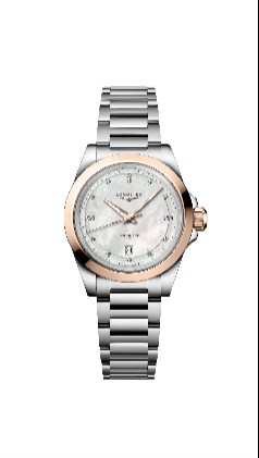 全新康卡斯悦动系列腕表,表盘直径30毫米,采用精钢与18K玫瑰金包金表圈及表冠组合材质,白色珍珠母贝表盘,镶嵌15颗上品韦塞尔顿VS-SI级钻石,直径0.80-0.85毫米,总重0.037克拉。3、6、9及12时处立体时标,其余小时以矩形时标呈现,均涂有Super-LumiNova®夜光涂层。配备三折式安全表扣的精钢表链,佩戴舒适且风格百搭。搭载浪琴表专属自动上链机械机芯,内置硅游丝及采用非磁性材料制成的创新组件,防磁性能超过ISO 764标准的十倍。表盘6时位置设有日期显示窗口。