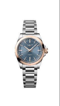 全新康卡斯悦动系列腕表,表盘直径30毫米,采用精钢与18K玫瑰金包金表圈及表冠组合材质,蓝色太阳纹表盘,搭配玫瑰金镀层指针。3、6、9及12时处立体时标,其余小时以矩形时标呈现,均涂有Super-LumiNova®夜光涂层。配备三折式安全表扣的精钢表链,佩戴舒适且风格百搭。搭载浪琴表专属自动上链机械机芯,内置硅游丝及采用非磁性材料制成的创新组件,防磁性能超过ISO 764标准的十倍。表盘6时位置设有日期显示窗口。