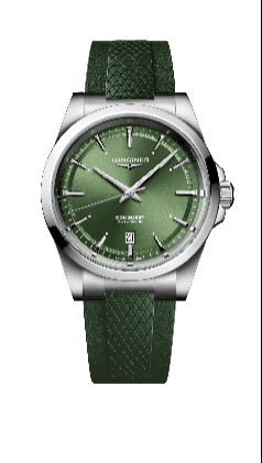 全新康卡斯悦动系列腕表,表盘直径41毫米,精钢表壳搭配黑色太阳纹表盘,同色表带与表盘相呼应。3、6、9及12时处立体时标,其余小时以矩形时标呈现,均涂有Super-LumiNova®夜光涂层。配备三折式安全表扣的精钢表链,佩戴舒适且风格百搭。搭载浪琴表专属L888.5自动上链机械机芯,内置硅游丝及采用非磁性材料制成的创新组件,防磁性能超过ISO 764标准的十倍。表盘6时位置设有日期显示窗口。绿色橡胶表带饰以沙漏图案,带有可微调的双重折叠式安全表扣。