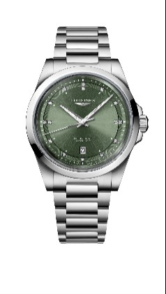 全新康卡斯悦动系列腕表,表盘直径41毫米,绿色表盘镶嵌钻石时标,3、6、9及12时处立体时标,其余小时以矩形时标呈现,均涂有Super-LumiNova®夜光涂层。配备三折式安全表扣的精钢表链,佩戴舒适且风格百搭。搭载浪琴表专属自动上链机械机芯,内置硅游丝及采用非磁性材料制成的创新组件,防磁性能超过ISO 764标准的十倍。表盘6时位置设有日期显示窗口。搭配精钢表链,带有可微调的双重折叠式安全表扣。