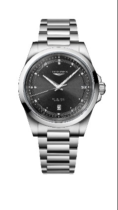 全新康卡斯悦动系列腕表,表盘直径41毫米,黑色表盘镶嵌钻石时标,3、6、9及12时处立体时标,其余小时以矩形时标呈现,均涂有Super-LumiNova®夜光涂层。配备三折式安全表扣的精钢表链,佩戴舒适且风格百搭。搭载浪琴表专属自动上链机械机芯,内置硅游丝及采用非磁性材料制成的创新组件,防磁性能超过ISO 764标准的十倍。表盘6时位置设有日期显示窗口。搭配精钢表链,带有可微调的双重折叠式安全表扣。
