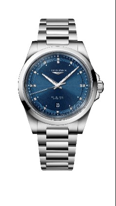 全新康卡斯悦动系列腕表,表盘直径41毫米,蓝色表盘镶嵌钻石时标,3、6、9及12时处立体时标,其余小时以矩形时标呈现,均涂有Super-LumiNova®夜光涂层。配备三折式安全表扣的精钢表链,佩戴舒适且风格百搭。搭载浪琴表专属自动上链机械机芯,内置硅游丝及采用非磁性材料制成的创新组件,防磁性能超过ISO 764标准的十倍。表盘6时位置设有日期显示窗口。搭配精钢表链,带有可微调的双重折叠式安全表扣。