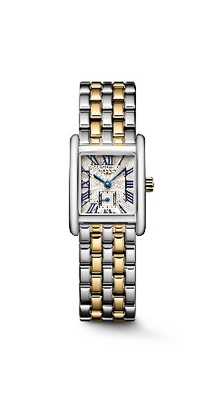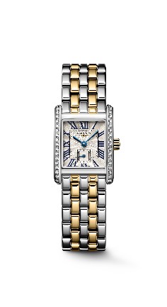 浪琴表迷你黛绰维纳系列腕表于今年推出四款新作,采用 21.50 ×29.00 毫米矩形精钢表壳,以精钢与玫瑰金或黄金材质打造而成,部分款式表圈镶钻。表链采用精钢材质,并搭配玫瑰金或黄金,链节以交错的形式精心组装,使腕表柔软舒适,自然贴合腕间。所有新作皆配备矩形的银色表盘,并饰以罗马数字。表盘缀饰别具一格的复古放射波纹,并以玑镂雕花工艺镌刻精巧的几何图形。蓝色漆绘罗马数字和蓝钢指针交相辉映,更显优雅别致。表盘6时处设有方形小秒盘,延续系列经典设计。别出心裁的全新时计,搭载高精度石英机芯,防水深度可达3巴(30米)。