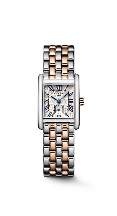诞生于2023年的浪琴表迷你黛绰维纳系列,传承奢雅经典。全新迷你黛绰维纳系列腕表,采用 21.50 ×29.00 毫米矩形精钢表壳,以精钢与玫瑰金材质打造而成,表链采用精钢材质,并搭配玫瑰金,链节以交错的形式精心组装,使腕表柔软舒适,自然贴合腕间。配备矩形的银色表盘,并饰以罗马数字。表盘缀饰别具一格的复古放射波纹,并以玑镂雕花工艺镌刻精巧的几何图形。蓝色漆绘罗马数字和蓝钢指针交相辉映,更显优雅别致。表盘6时处设有方形小秒盘,延续系列经典设计。搭载高精度石英机芯,防水深度可达3巴(30米)。