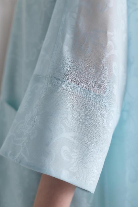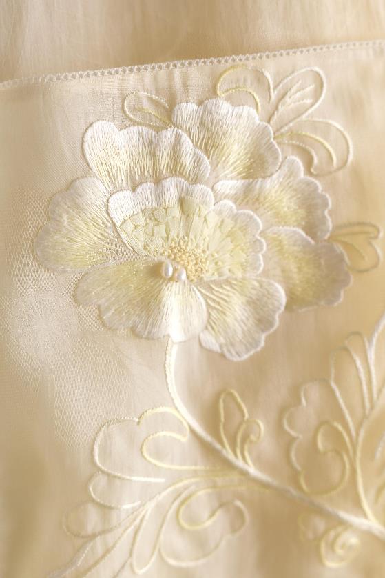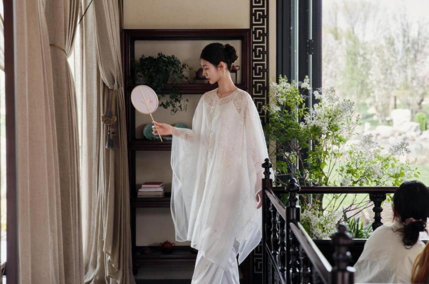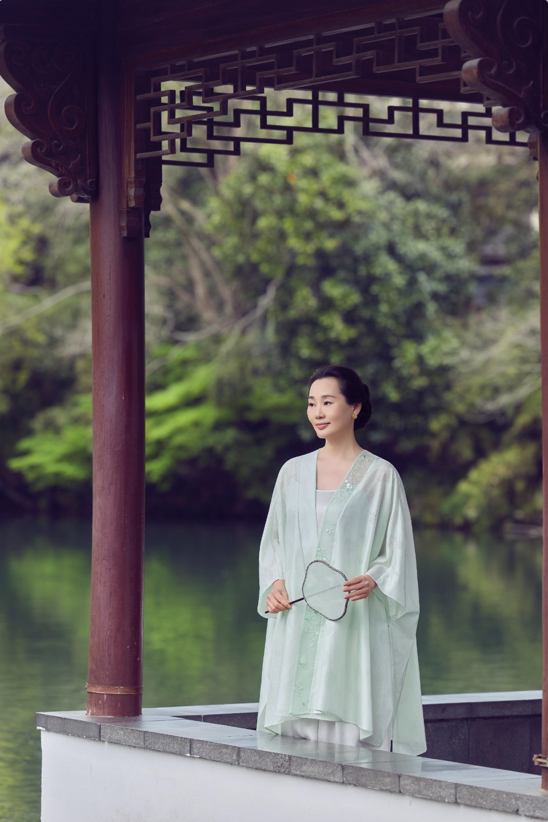 本系列以花罗为主打材质,辅以软烟罗、绡缎、双绉印花、正绢、缂丝等顶级天然面料, 光泽与垂感构成衣衫的温润底色。园中春意亦化为衣上纹样:缠枝纹象征生生不息,竹 叶纹隐喻君子品格,蝴蝶纹承载美好祝福。工艺则融汇非遗织造与精细手工,以刺绣、 缂丝、印染等技法,在衣帛上再现“春云浮空,流水行地”的意境,每一处针脚,都凝 结着手工的体温与时间的凝视。