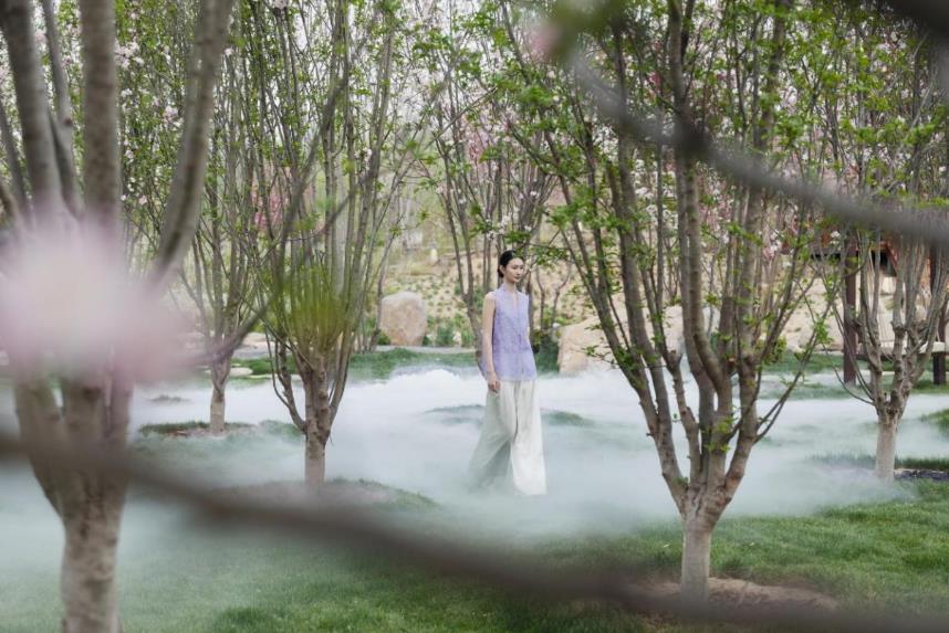 时装秀选址京郊五云间·蹊园。这座占地 25 亩的园林,有绿竹幽径、溪谷牡丹、荷风 游鱼,亦有百草嘉卉、时令果蔬,耕读游憩皆宜。时值仲春,海棠铺绣,牡丹着锦,园 中一派烂漫生机。五云间创始人西华女士,曾深耕娱乐、公关、戏剧等多重领域,后沉 浸于东方美学,从高级定制服装起步,创立了中式浪漫美学生活品牌“五云间”。蹊园 是她日常创作与安顿身心的一方天地。